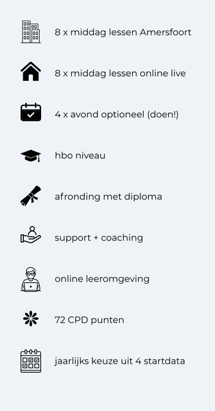 Dit betekent dat je het leeswerk, videos en voorbereidingen via e-learning kunt doen en de momenten die echt nodig zijn om elkaar live, in Amersfoort, te zien efficient worden ingezet. Op deze manier kunnen we het beste van alle leervormen inzetten om je zo goed mogelijk te begeleiden.